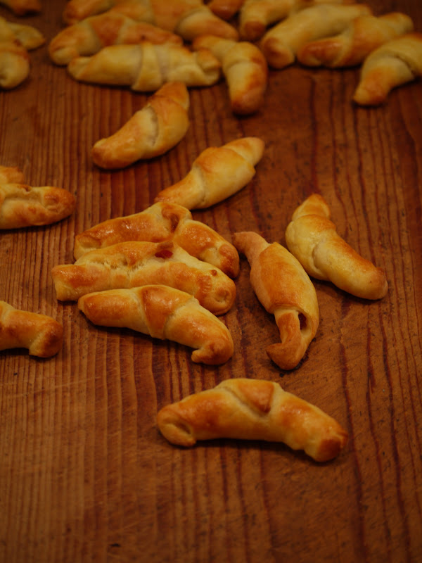 Roll out the dough thinly with a rolling pin, cut it in triangles, fill them with ham and fold them into tiny croissants. Beat the egg and brush the croissants with it.
